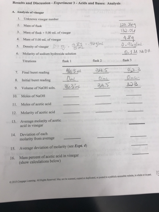Show all work for each step in the spaces provided. Unknown vinegar number Mass of flask. Final burette reading 3022 mL 5.
